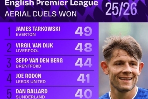 体育资讯11月11日讯 英超联赛已经进行了11轮,squakwa也统计了本赛季英超空中成功对抗次数,塔科夫斯基力压范戴克居首。