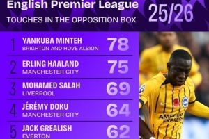 体育资讯11月11日讯 英超联赛已经进行了11轮,squakwa也统计了本赛季英超在对方禁区内触球次数情况,明特力压哈兰德居首。