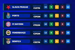布拉格斯拉维亚(身价1.07亿欧)——9胜6平积33分