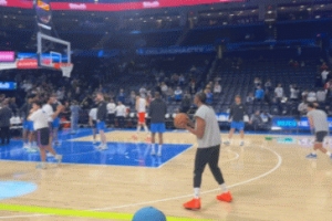 体育资讯11月12日讯 杰伦·威廉姆斯在今天主场对阵勇士赛前进行投篮训练,他那只正在恢复中的右手腕仍然缠着护具。