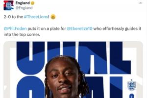 英格兰官方在播报进球时写道:“三狮军团2-0领先!福登将球喂到嘴边,埃泽毫不费力地将球送入上角。”
