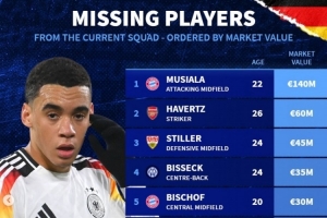 德国落选本期国家队球员身价榜:穆西亚拉1.4亿欧居首 哈弗茨第二