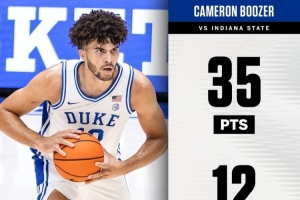 体育资讯11月17日讯 在此前的一场NCAA比赛中,杜克大学100-62大胜印第安纳州立大学。卡梅隆·布泽尔狂砍35分12篮板5助攻3抢断3盖帽。而这仅仅是他代表杜克打的第四场正式比赛。