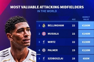 体育资讯11月2日讯 德国转会市场列出了进攻型中场身价排名,贝林厄姆1.8亿欧居首,穆西亚拉1.4亿欧次席。