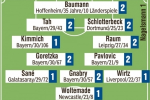 后卫:基米希(1)、若纳坦-塔(2)、施洛特贝克(2)、劳姆(2)