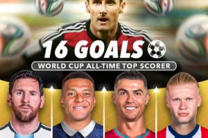 目前世界杯历史射手王是克洛泽,他在随德国队参加的4届世界杯中打进16球,超越了15球的罗纳尔多。现役球员中,已经打进13球的梅西与12球的姆巴佩,明年世界杯均有机会超越克洛泽,而8球的凯恩、C罗、内马尔难度则比较大。