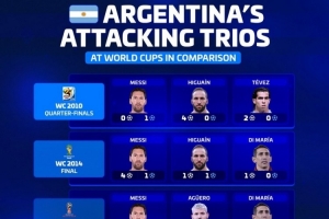 体育资讯11月19日讯 德国转会市场列出了阿根廷队近5届世界杯的锋线三叉戟,并预测明年世界杯梅西、阿尔瓦雷斯、马斯坦托诺在锋线搭档。