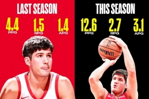 谢泼德本赛季场均12.6分2.7篮板3.1助攻1.6抢断,三项命中率49.1/47.8/66.7%;