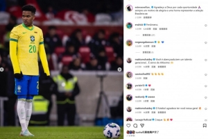 埃斯特旺也在社媒晒出本场照片,配文写道:“为每一次机会感谢上帝,能够代表巴西国家队出战一直是一份荣誉!”