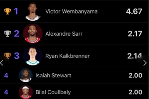 场均封盖榜上,第二名萨尔约为2.2次。而总封盖数上,文班6场比赛28次、第二名的卡尔克布伦纳7场15次。