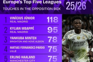 禁区触球榜:维尼修斯压姆巴佩居首,哈兰德、亚马尔、萨拉赫在列