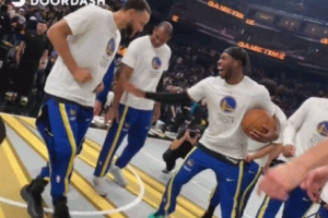 赛前,勇士众将围成一圈,库里在中间翩翩起舞,妖娆舞姿引得众人大笑。