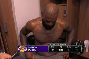 赛后,詹姆斯在更衣室接受采访时仅用一条毛巾遮住重要部位,并不时调整。
