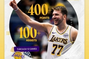 体育资讯11月26日讯 湖人当家球星卢卡·东契奇本赛季出战12场已达成400分100助,成为NBA历史首人。