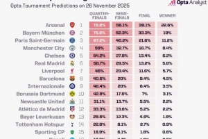 体育资讯11月27日讯 本轮欧冠战罢,数据网站OPTA也更新了本赛季欧冠夺冠概率,其中阿森纳最被看好,具体夺冠概率如下: