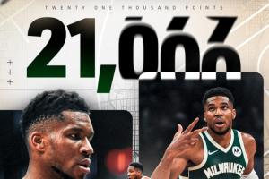 字母哥(30岁零358天)是NBA历史拿到21000分第六年轻的球员,前五是詹姆斯(28岁零97天)、张伯伦(29岁零184天)、科比(29岁零194天)、杜兰特(30岁零23天)和乔丹(30岁零34天)。