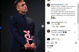 劳塔罗社媒晒出领奖的照片,并写道:“感谢所有投票支持我的球员,是你们让我获得了这个奖项。”