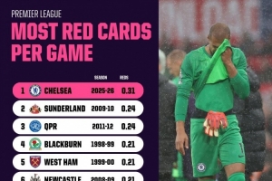 体育资讯12月2日讯 Opta统计了英超球队各赛季的场均红牌数量,并列出英超历史单赛季场均红牌数量排名,本赛季切尔西0.31张居首。