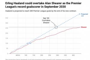 现在的问题是,哈兰德何时能打破希勒保持的英超进球纪录(260球)?希勒的这项纪录自2006年4月打入最后一球之后,一直无人能破。