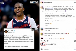 在为这支表现不佳的球队奉献了职业生涯一半的时间后,克里斯·保罗本打算回到快船队,以一个完美的赛季结束自己的篮球生涯。然而,在赛季开始仅一个月后,这位即将退役的老将却在深夜被球队“送回家”。这一举动引发了球迷的强烈不满,有球迷在推特上直言:“快船管理层的行为简直是犯罪。”