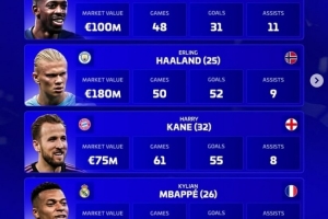 哈兰德(曼城,25岁,挪威):身价1.8亿欧,50场,52球,9助攻