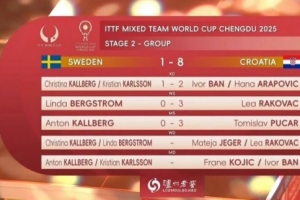体育资讯12月5日讯 国际乒联成都混合团体世界杯第二阶段,克罗地亚8-1瑞典。