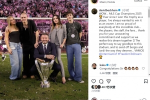 迈阿密国际老板贝克汉姆社媒晒家人与奖杯的合照,并写道:”2025年美职联冠军🏆自从作为球员捧起这座奖杯后,我就一直渴望以老板身份再次夺冠。”