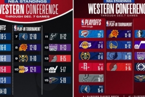去年今天,联盟排名如上图,当时独行侠西部第二,勇士第五,快船第六,湖人12胜11负第十。