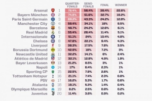 opta本赛季欧冠夺冠概率: