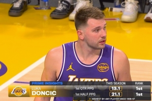 湖人VS马刺,转播方晒出统计,东契奇场均首节13.1分&上半场21.1分,都是有统计(96-97赛季)以来的最高。