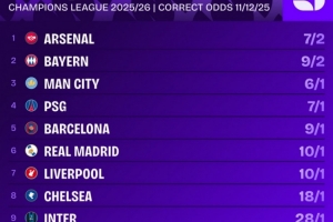 体育资讯12月11日讯 欧冠联赛阶段第6轮比赛战罢,相关机构列出了各队夺冠的赔率,阿森纳居首。
