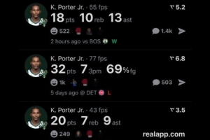 过去五场比赛,小波特连续四场得分20+,其中两场30+,第五场则砍下18+10+13的三双。