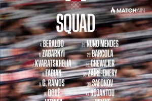 前锋:7-克瓦拉茨赫利亚、9-贡萨洛·拉莫斯、14-杜埃、19-李刚仁、29-巴尔科拉、47-恩贾恩图、49-姆巴耶
