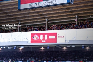 本场比赛桑德兰主场观众席上方的比分牌上并未展示出纽卡的队徽,而仅仅是以英文visitors(客队)替代。