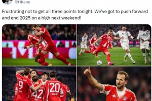 本场比赛凯恩点射破门,赛后他在社媒鼓励球队写道:“很失望今晚未能全取三分,我们必须全力以赴并在下周比赛中为今年完美收官。”