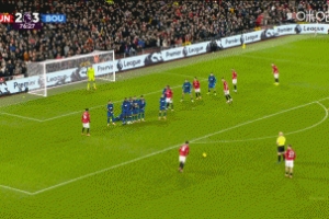 体育资讯12月16日讯 英超第16轮,曼联主场迎战伯恩茅斯,比赛第77分钟,B费任意球直接破门,曼联3-3扳平比分。