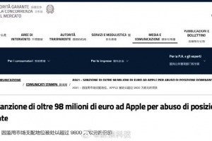 体育资讯12月22日讯 意大利竞争与市场管理局(AGCM)今日宣布,对苹果公司、Apple Distribution International 和苹果意大利公司处以 9863.5 万欧元(现汇率约合 8.14 亿元人民币)罚款,原因是滥用市场支配地位。