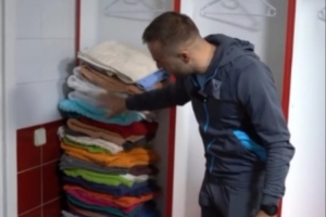 视频中最引人注目的部分包括理疗室没有灯光,从高处取下的一堆破损且连在一起的衣架,以及每条毛巾颜色和款式各不相同。