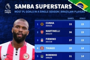 英超单赛季巴西射手榜:库尼亚、小马丁、菲米15球,伊戈尔已14球