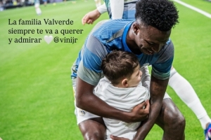 维尼修斯遭到皇马球迷的嘘声对待,皇马中场巴尔韦德社媒晒出儿子与维尼修斯拥抱的照片,力挺队友:“我们一家永远爱你敬你。”
