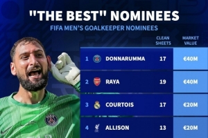 体育资讯11月7日讯 FIFA公布了年度最佳男足门将候选名单,德国转会市场列出了入围者身价排名,多纳鲁马、拉亚4000万欧居首。