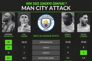 强援!塞梅尼奥本赛季英超10球3助,福登7球2助、多库1球4助