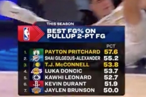 急停跳投两分球命中率,普里查德57.6%,力压亚历山大排名第一。