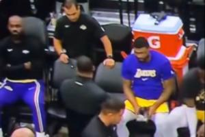 视频中复盘的球迷破防:“雷迪克正想对全队讲话呢,勒布朗你人在哪?有人看到勒布朗了吗?原来他在那儿像个受气的小媳妇儿一样噘嘴闹情绪呢。(Pouting like a little b**ch)”