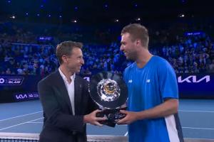 体育资讯01月14日讯 澳网一球制胜决赛,业余球员史密斯对阵葛兰乔安娜,最终,史密斯战胜对手,拿下100万澳元奖金。在赢得比赛后,史密斯双手抱头难以置信。