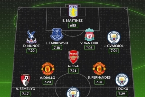 后卫:穆尼奥斯(水晶宫,7.20分)、塔科夫斯基(埃弗顿,7.18分)、范戴克(利物浦,7.05分)、格瓦迪奥尔(曼城,7.04分)