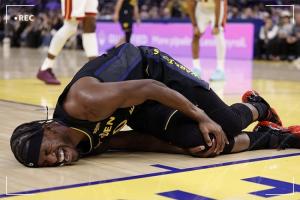 今日NBA常规赛,勇士在主场以135-112大胜热火。第三节还剩下7分多钟时,勇士进攻回合,吉米·巴特勒接应波杰姆斯基传球,在对抗中倒地不起,捂着右膝,表情痛苦,勇士立马喊出暂停,多人围上前查看巴特勒伤势。随后,巴特勒被队友希尔德和库明加架着回更衣室,其右脚不能受力,但离场时他还面带笑容。