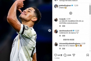 体育资讯1月21日讯 欧冠联赛阶段第7轮,皇马6-1大胜摩纳哥。赛后,皇马中场贝林厄姆在社交媒体晒图,庆祝球队获胜。