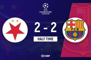 上半场伤停补时2分钟,半场结束,巴萨暂2-2布拉格斯拉维亚。