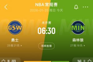 体育资讯01月25日讯 名记Shams报道,原定今日06:30进行的,森林狼主场对阵勇士的比赛被延期至26日06:30。